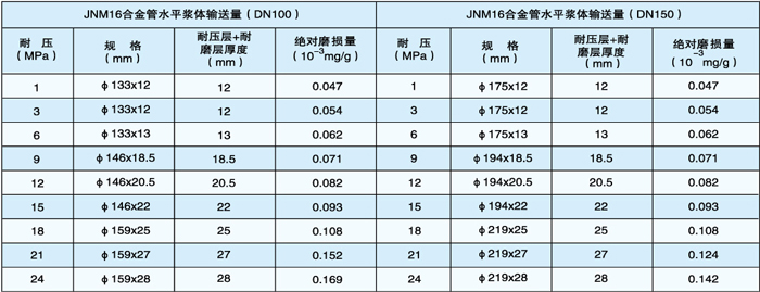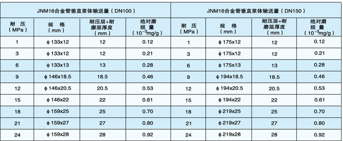 注:除表中所列规格尺寸外,高压耐磨管件壁厚可根据磨损率和实际浆体输送量增减。