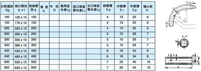 弯管尺寸及规格 ( 表中a、R、L0、L1、L2依设计要求确定 )